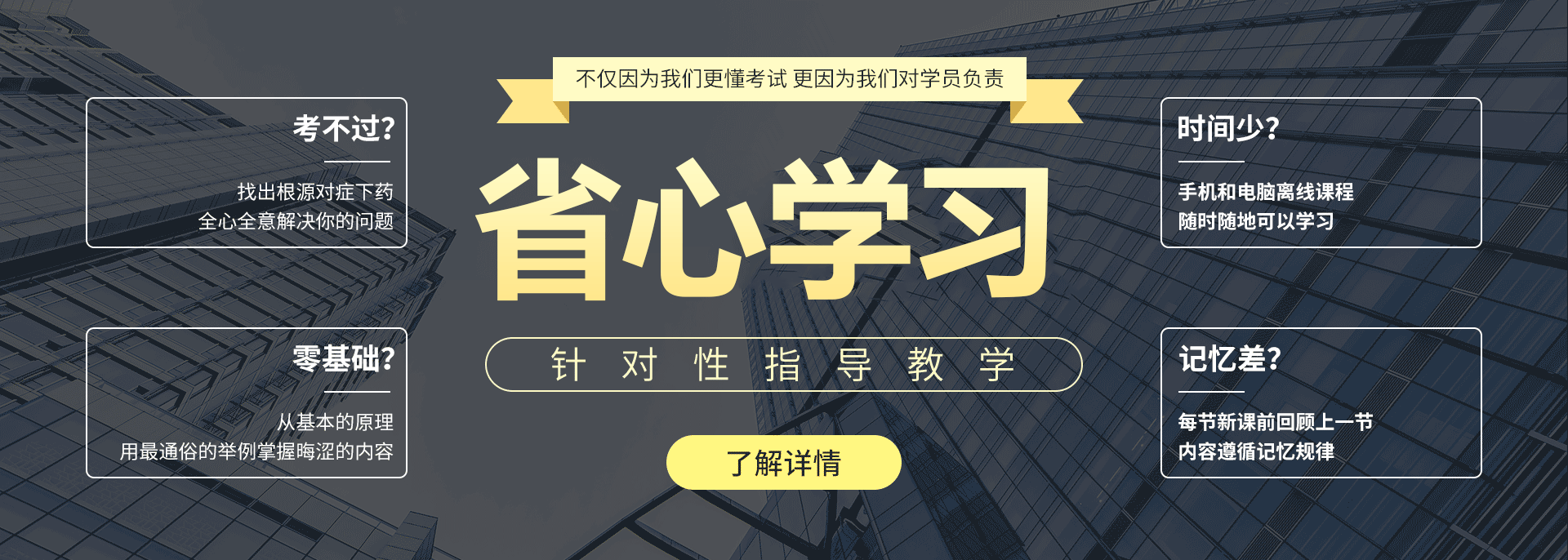 根据学员的基础、时间,以考试通过为目的,去繁化简,只讲有用的考试干货,用最少的时间快速掌握必考内容,高效省时